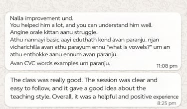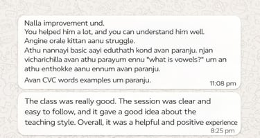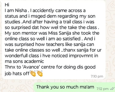 "It was good experience for my child. He cannot understand how to read properly. The teacher helped a lot. Thank you Sanija mam"